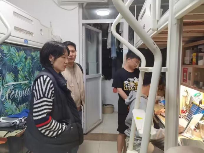 在研究生宿舍,李岚书记详细询问了我院2022级研究生对学校住宿条件、生活环境的适应情况,了解、关心研究生科研学习情况。同学们认真倾听,和老师们交流自己在学习和生活上的疑惑与想法。