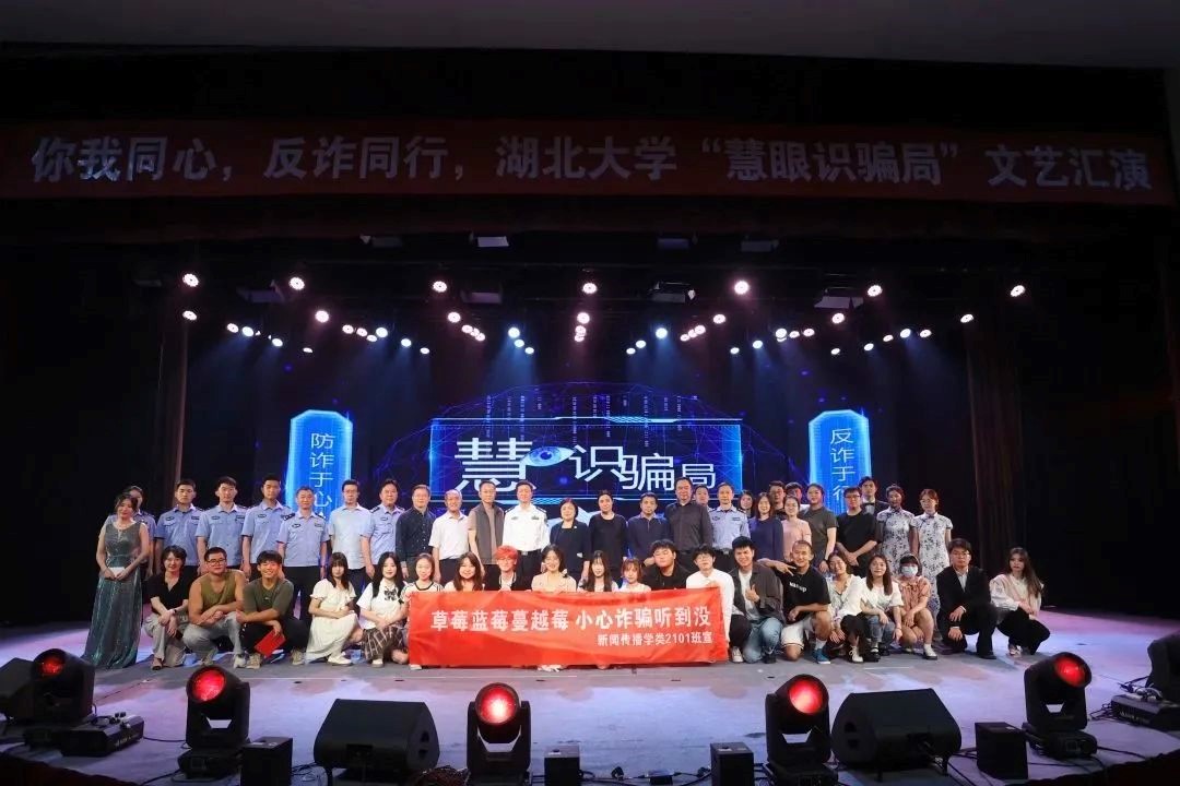 “千万不要给陌生人转账,谨防上当受骗!”警察走上舞台,和学生一起讲解防诈常识,给观众打了一剂“预防针”。5月25日晚,我校小礼堂正在进行一场“慧眼识骗局”文艺汇演。湖大同学们自创自演,联动武汉民警,通过相声、小品、魔术等喜闻乐见的形式,向全校师生宣传防诈知识。