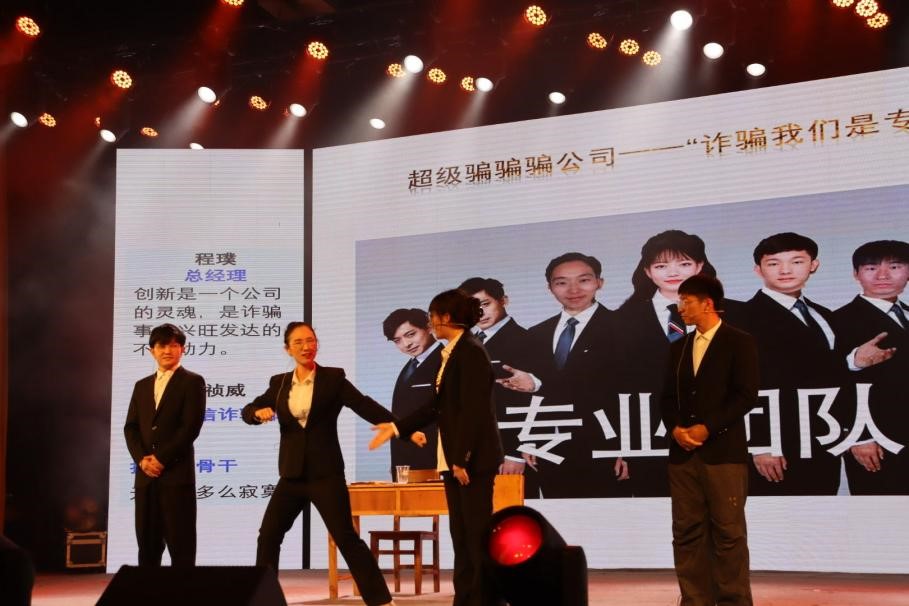 活动开始前,屏幕上播放的反诈视频让现场师生身临其境。学生们取材于生活,自己编写剧本,将真实案例融入表演中,以生动活泼的方式揭秘了网络诈骗的套路,赢得观众的阵阵掌声。