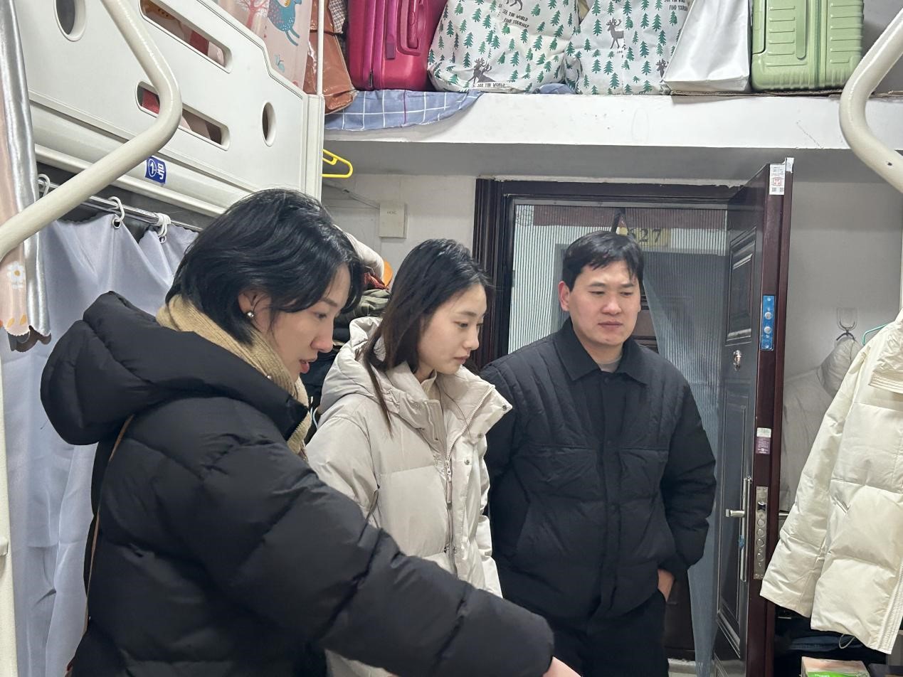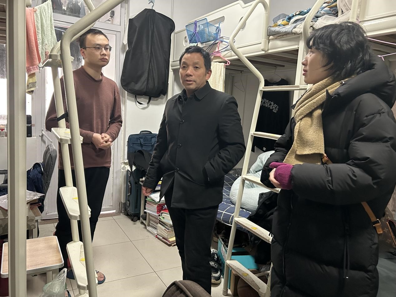 彭院长一行走访本科生寝室,开展假期宿舍安全卫生大检查,了解留校本科生关于寒假期间学习、生活保障等方面需求情况,彭院长在关心学生同时开展了安全教育,要求大家遵守公寓管理规定,出现困难及时联系辅导员老师,并强调离校前将宿舍断水断电,消除安全隐患。