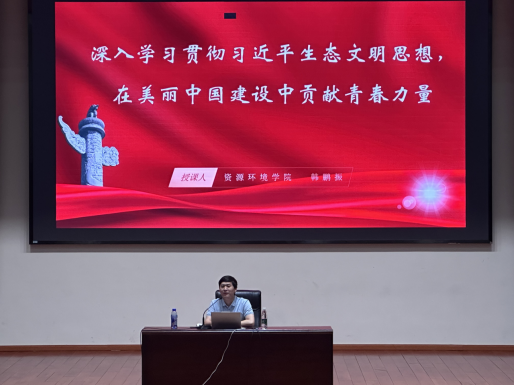 首先,助教韩鹏振进行主题为“汇聚青春力量,点亮美丽中国”的讲座。他强调要加强学生对生态文明建设、绿色发展的理解。呼吁学生在美丽中国建设中贡献青春力量。