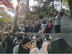 随后,同学们在五老峰相互搀扶,陆陆续续登上五峰,登山时崎岖的山路和浓雾更为实习增添了挑战。随后,师生又共同前往三叠泉,走过一千三百多级台阶,抵达目的地,完成了本次野外实习所有行程。