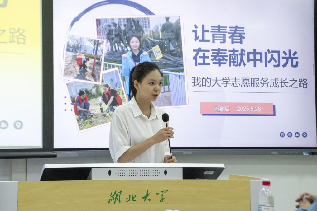 2021级地理科学(师范)专业周雯雯,分享了如何将志愿服务与专业发展相结合的心得。作为前学院团委副书记和第27届研究生支教团团长,在校期间,她不仅积极参与沙湖环保志愿队、红十字急救培训等公益实践,同时注重专业能力提升,先后考取教师资格证、参与地理学科竞赛并完成专业实习。谈及选择支教保研的初衷,她表示:“因为热爱所以选择”。在分享成长历程时,周雯雯以自身经历为例,建议学弟学妹们通过课堂研讨、科研项目、专业竞赛等多渠道提升综合素质,并鼓励大家勇于挑战自我,并表示参与环保志愿服务既是专业实践的延伸,也是缓解压力、实现自我价值的有效途径。最后,她也希望学弟学妹们能够珍惜大学时光,勇于尝试和追梦,用知识和努力创造美好未来。