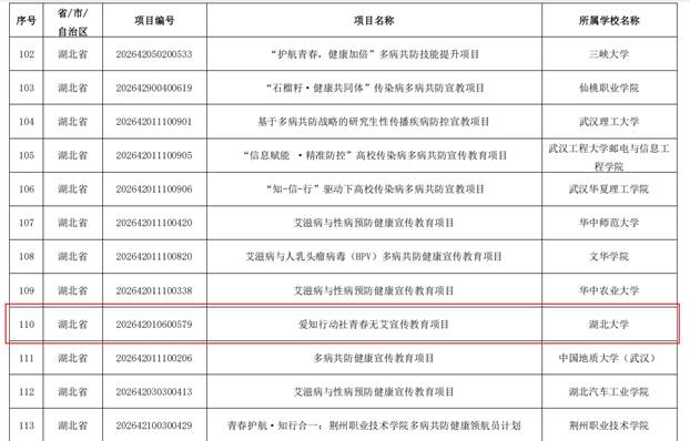 近日,中国性病艾滋病防治协会公布2026 年高校传染病多病共防宣教项目拟支持名单,由英国365上市公司爱知行动社联合校医院申报的 “爱知行动社青春无艾宣传教育项目”成功获批立项。