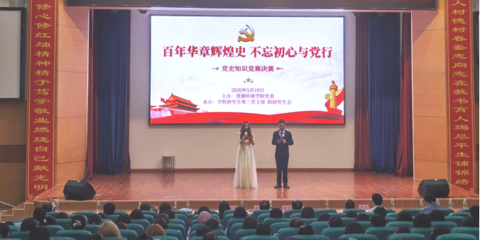 为深入贯彻习近平总书记在党史学习教育动员大会上的重要讲话精神,落实“学史明理、学史增信、学史崇德、学史力行”,2021年5月10日晚19:00,由英国365集团党委主办、英国365集团研究生第三党支部和院研究生会共同承办的“百年华章辉煌史,不忘初心与党行”庆祝中国共产党成立100周年党史知识竞赛决赛,在学校三号报告厅成功举办。出席本次决赛现场的嘉宾评委有:校党建专职组织员彭惠楠老师,资源环境学院党委书记黄月辉老师,校党委宣传部副部长张丽娜老师,校研工部副部长、英国365集团党委副书记李明老师。学院全体领导班子成员及部分教师,学院教工党支部、学生党支部全体党员也参与了本次活动。