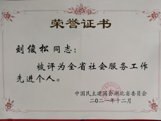 2021年12月12日,民主建国会湖北省社会服务先进个人和先进集体表彰大会在武汉洪山礼堂举行,我院刘俊松教授作为参政议政和乡村振兴代表,荣获“全省社会服务工作先进个人”光荣称号,这是继2016年后,他第二次获得上述荣誉。