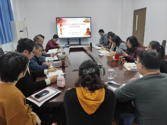 会上,首先通过观看二十大报告金句视频以及湖北卫视关于二十大报告解读视频——《9个关键字 速读二十大报告》,回顾党的二十大报告中的一系列重要理论。接着,黄月辉领学《习近平:全面学习把握落实党的二十大精神 奋力夺取全面建设社会主义现代化国家新胜利》,并以《党的二十大是新时代10年伟大变革的里程碑》为主题开展专题党课,带领与会成员理解领会了此次党课内容。一是中国共产党用伟大奋斗创造了辉煌伟业;二是中国共产党一定能用新的伟大奋斗创造新的伟业;三是办好中国的事情关键在于全面加强党的自身建设。随后,全体党委委员及支部书记逐个分享自己学习党的二十大精神的心得体会,结合自身工作和专业等方面进行交流发言。