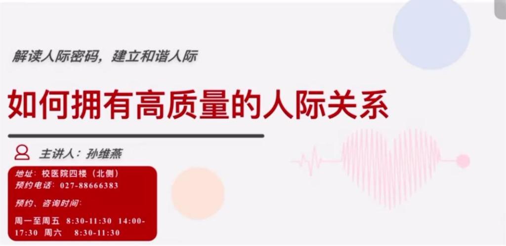 11月8日,孙维燕老师以如何拥有高质量的人际关系为主题开展第一场讲座,参会学生认真聆听并了解了如何解读人际密码,建立和谐的人际。孙老师分别讲述了人际关系的基本含义、功能和价值,影响人际关系的心理因素以及掌握人际交往的技巧三个方面的主要内容,让学生认识到人际关系的重要性,知晓了自己的交际方式,并从中了解到学会倾听与换位思考才是提高共情能力的方法。