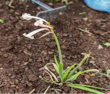 不一会儿的功夫,大家就迅速进入了状态,挖土、整平、把杂草连根拔起,时不时听见大家的欢声笑语,看见昆虫们活跃的身影,突然一声惊喜的声音传来:“快看,它开花了!”此时,一株风雨兰上挂着的粉白色花苞在离开了杂草的遮挡后显露出来,它的出现让所有人脸上的笑容更加璀璨。