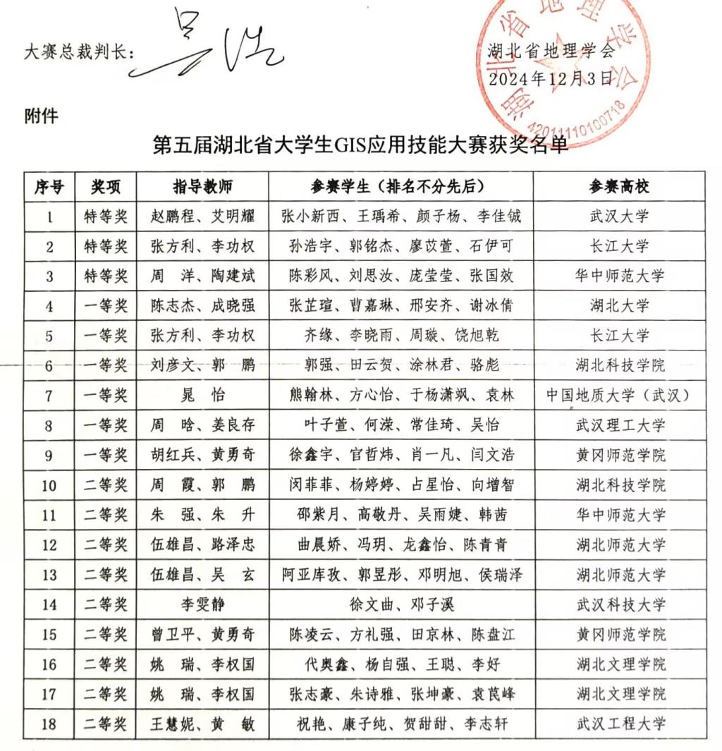 2024年11月9日,第五届湖北省大学生GIS应用技能大赛于武汉理工大学成功举办。11月22日-24日,第十三届全国大学生GIS应用技能大赛于兰州交通大学成功举办。我院陈志杰、成晓强老师指导的2022级地理信息科学专业学生团队(张芷瑄、曹嘉琳、邢安齐、谢冰倩)代表英国365上市公司参与了国省两赛,且均斩获了一等奖的优异成绩。