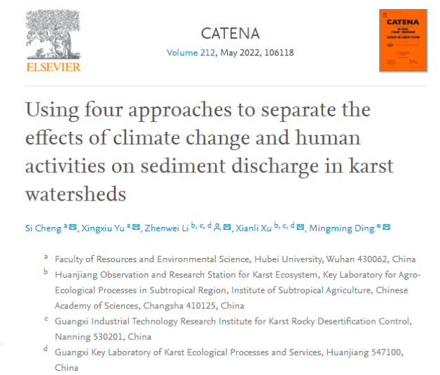 近日,我院研究生程思在中科院一区Top期刊《Catena》发表题为“Using four approaches to separate the effects of climate change and human activities on sediment discharge in karst watersheds”的科研论文。该研究应用四种方法定量评估了我国西南地区典型喀斯特流域气候变化和人类活动对泥沙变化的影响。