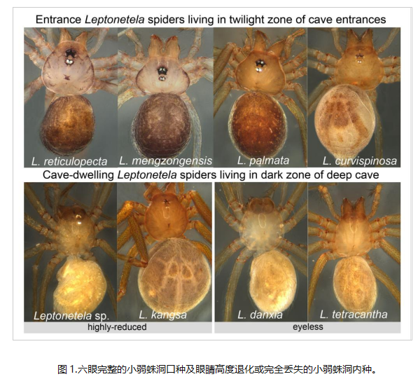 近年来,越来越多的研究发现,一些生活在无光环境中的无眼地下动物依然保留了感光能力,其背后的驱动力及演化过程有待探索。一部分研究者提出无眼地下动物不再需要感光能力,是由于中性进化时间不够长,处于正在丢失的过程中,即中性选择假说;也有研究者提出感光功能对于无眼地下动物仍然重要,有助于它们选择栖息地、逃避洞外天敌和竞争者,因此其保留是自然选择驱动的结果,即自然选择假说。刘杰教授团队利用广泛分布于中国西南地区喀斯特溶洞中的小弱蛛洞内种及洞口种来检验上述两种假说(图1)。