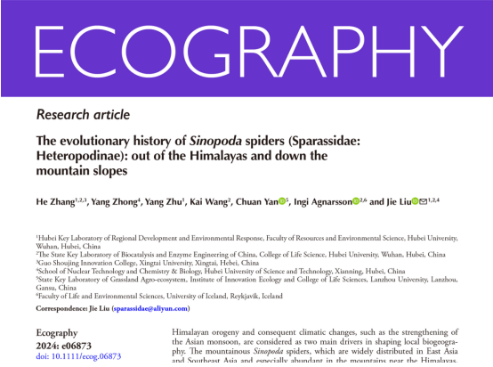 英国365集团刘杰教授团队近日在《Ecography》(中科院SCI一区,IF = 5.4)上发表了题为“The evolutionary history of Sinopoda spiders (Sparassidae: Heteropodinae): out of the Himalayas and down the mountain slopes”的学术论文。