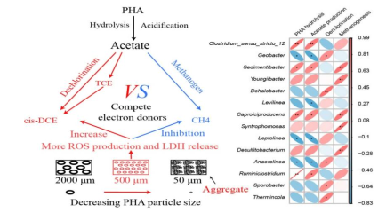 相关研究表明产甲烷古菌会与氯代烃降解菌竞争有限的电子供体,从而降低氯代烃脱氯效率。因此,如何选择性抑制产甲烷古菌竞争电子成为氯代烃原位生物修复的关键问题。本研究提出了一种新思路,通过调节固相电子供体缓释材料聚羟基烷酸脂(PHA)的粒径以产生更多的活性氧物种,从而优先抑制产甲烷古菌的丰度和竞争电子速率,最终提高氯代烃降解效率。研究发现500μm粒径PHA可以显著地提高原位生物修复过程中电子供体的利用效率,氯代烃降解菌电子利用率较传统粒径下的36.75%提升至94.82%。该理论还可以应用于修复其它有机物和重金属污染场地,前景广阔。