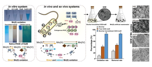 锰(Mn)污染对生态系统和人类健康构成严重威胁。微生物Mn(II)氧化技术因其高效、低成本和环境友好等优势,在锰污染修复领域备受关注。该团队将表达锰氧化酶KatB的工程菌固定在生物炭上,显著缩短了菌株环境驯化时间,有效解决了细胞易流失、环境适应差和固液分离难等问题,显著提高了菌株的锰氧化和去除效率。