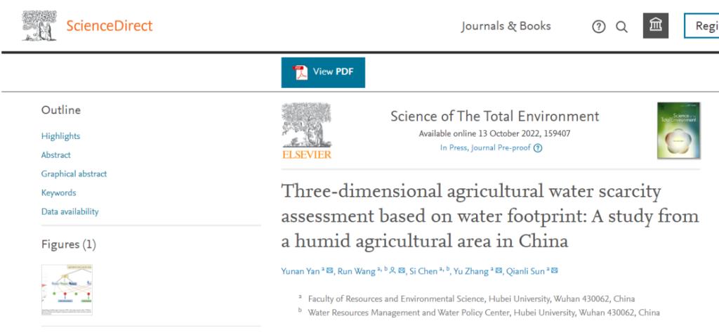 近日,我院王润教授及其研究生严宇男在环境科学一区top期刊《Science of The Total Environment》发表了题为“Three-dimensional agricultural water scarcity assessment based on water footprint: A study from a humid agricultural area in China”的研究论文。