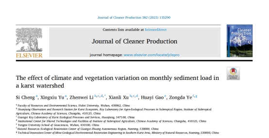 近日,我院于兴修教授团队博士研究生程思在中科院一区Top期刊《Journal of Cleaner Production》(IF=11.072)发表题为“The effect of climate and vegetation variation on monthly sediment load in a karst watershed”的科研论文。该研究运用偏最小二乘结构方程模型,揭示气候和植被变化对喀斯特流域月尺度输沙量的影响。