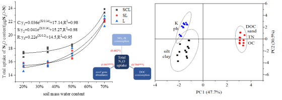 稻田是全球重要的土地利用方式之一,不同水分状态下土壤N2O消耗过程将对稻田N2O净排放量的削减做出不同贡献。但目前有关水分含量对稻田土壤吸收消耗N2O过程的影响机理及其微生物调控机制的系统研究较为缺乏。本研究选取中国亚热带农业区域较为典型的三种母质发育水稻土作为研究对象,通过外源添加N2O气体和控制土壤水分含量,探究(1)稻田土壤在不同水分条件的N2O吸收消耗能力;(2)nosZ基因丰度对稻田土壤不同含水量的响应;(3)N2O吸收与nosZ基因丰度及其他理化因素之间的关系。结果显示,三种水稻土在20%含水量下N2O消耗比例可达到50.71%以上,且N2O消耗量随含水量的增加而呈指数增加(R2≥0.95),表明水稻土在不同水分条件下均具有消耗大量N2O的能力,这与土壤的DOC消耗量和nosZ基因丰度增量极显著正相关(P<0.001)。该研究成果为不同水分条件下稻田土壤N2O减排提供重要参考。