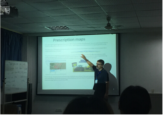 Raffaele Casa首先介绍了图思雅大学的基本情况,结合自身研究和工作实践,系统阐述了自己做过的研究以及目前正做的一些全球化合作的研究话题。整场交流虽然短暂,但是十分有趣。报告主要讲到用卫星对农田的遥感数据采集,无人机上搭载遥感器对农田遥感数据的采集,以及用新仪器放在土壤中对土地进行信息采集。Raffaele Casa说前二者价格比较昂贵并且花费时间较长。第三种方式既简单又便宜且三者得到的数据不同,把三者结合起来又得到新的遥感影像,用这种方式可以得到比普通方式更多的光谱波段,可以得到上百种。