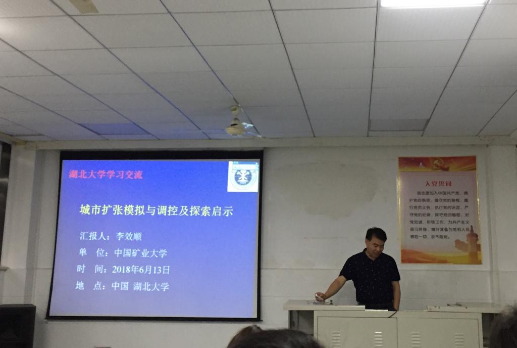 2018年6月13日上午9:40,在我院一楼会议室开展了题为《城市扩张模拟与调控》的绿色讲坛讲座,此次讲座我们邀请到中国矿业大学李效顺教授。讲座由金贵老师主持,谢启姣老师、张蕾老师等以及部分研究生共同参与了讲座。