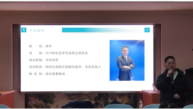 来自19级生态学专业的周宇同学以诙谐幽默的语言讲述了自己的湖大之旅,从个人简介、研究方向与思考、实践与教学三个方面来进行介绍。从科研经历和心路历程等方面分享了自己在研究生阶段的收获与成长,介绍了自己在获得国家奖学金的前期、中期、后期的努力与变化,分享了许多经验与心得。周宇同学在分享中点明其实生活中随处可以学习,处处都可以有收获。分享最后,周宇同学也提出了自己的三点建议:一、我们要学会主动学习,研究生在学习上讲究的是一种更为主动地学习方法和意识;二、合理安排时间,研究生的生活是紧张而忙碌的,我们需要为自己制定好总体的进度安排,做到自己掌握主动权而不是被时间追着跑;三、找到定位,研究生阶段的学习过程中,不仅要学会自主学习,还要明确未来的发展方向。
