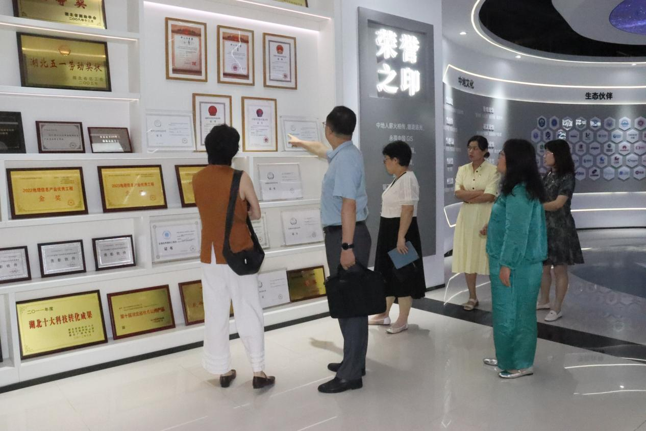 在“第一代卡式加密狗”展区,党员们驻足于企业自主研发的MapGIS平台发展历程墙前,深刻体会到“关键核心技术必须牢牢掌握在自己手中”的使命担当。地理信息科学党支部书记王红结合航天应用实例,生动阐释了国产GIS技术的突破性成就:“在神舟系列飞船的返回搜救任务中,MapGIS在4秒内便可“捕捉”到返回舱位置,为航天员安全着陆提供最优路径规划和快速搜救支持。中地数码的创新发展历程,正是中国科技工作者勇攀高峰、自主创新的生动写照。作为教育工作者,我们要将这种攻坚克难的科研精神融入育人实践,为国家培养更多优秀人才。”