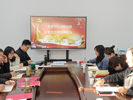 会议第四项,开展支部书记述职会暨党支部考核测评会。该阶段由人文地理与城乡规划教工党支部书记胡道华和地理学研究生党支部书记闫华涛作为代表进行现场述职。胡道华书记从支部成立、教师管理、带头引领等方面作汇报;闫华涛围绕支部概况、主要工作、组织概况等方面进行汇报,两位支部书记代表分别从教工和学生层面进行述职发言,其述职报告各具特色、各有侧重。